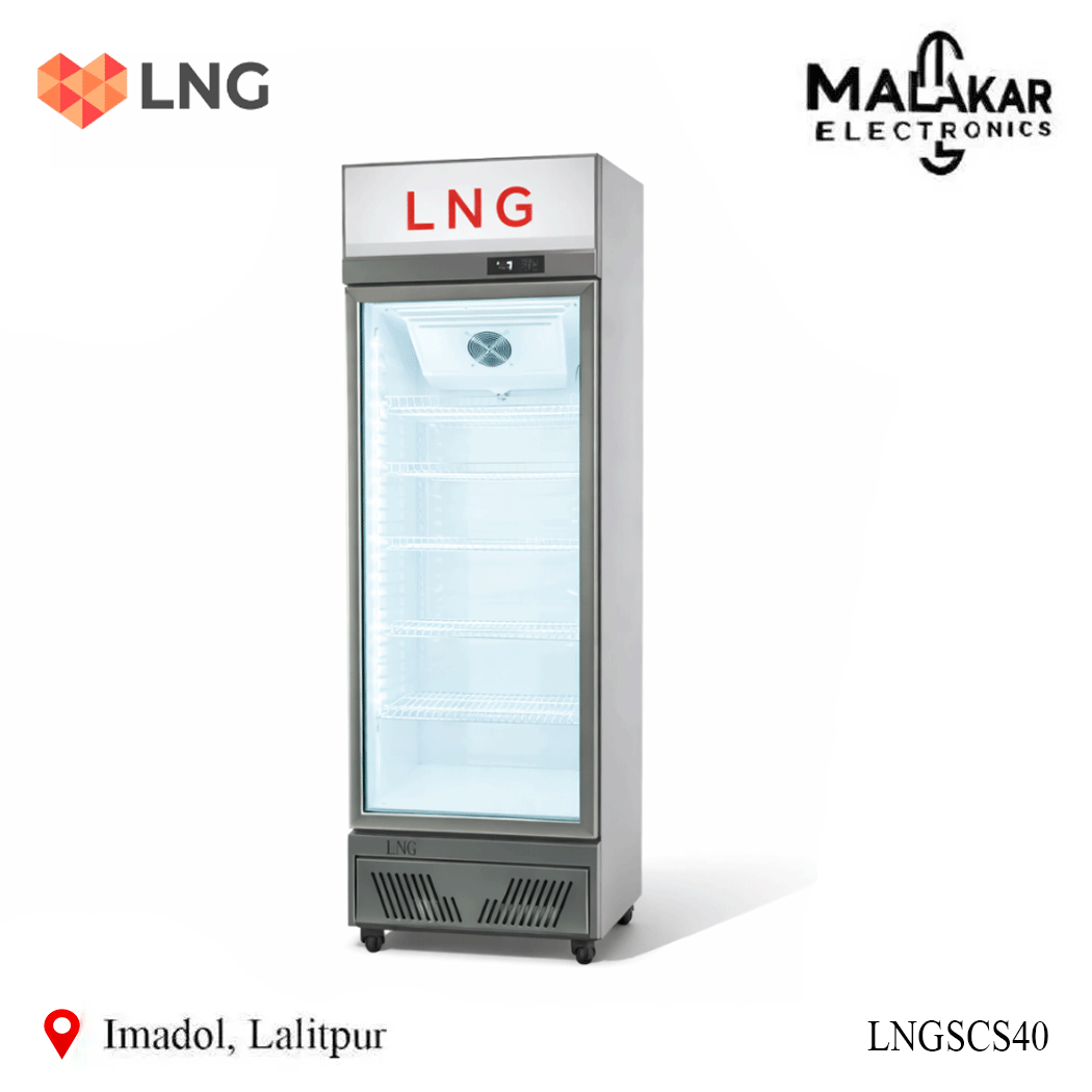 LNG 400L Showcase Chiller LNGSCS40 (Air Cooling) is a high-performance 400-litre display fridge designed for supermarkets, retail shops, restaurants, and cafes. It combines powerful cooling with a durable and stylish design to keep beverages, dairy, and packaged foods fresh while ensuring an attractive display. Its compact footprint and sleek white body with silver aluminum door make it suitable for a variety of commercial spaces.